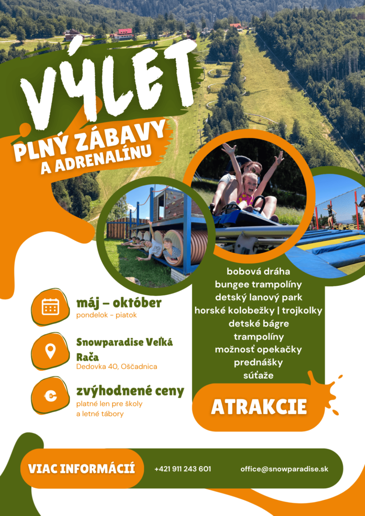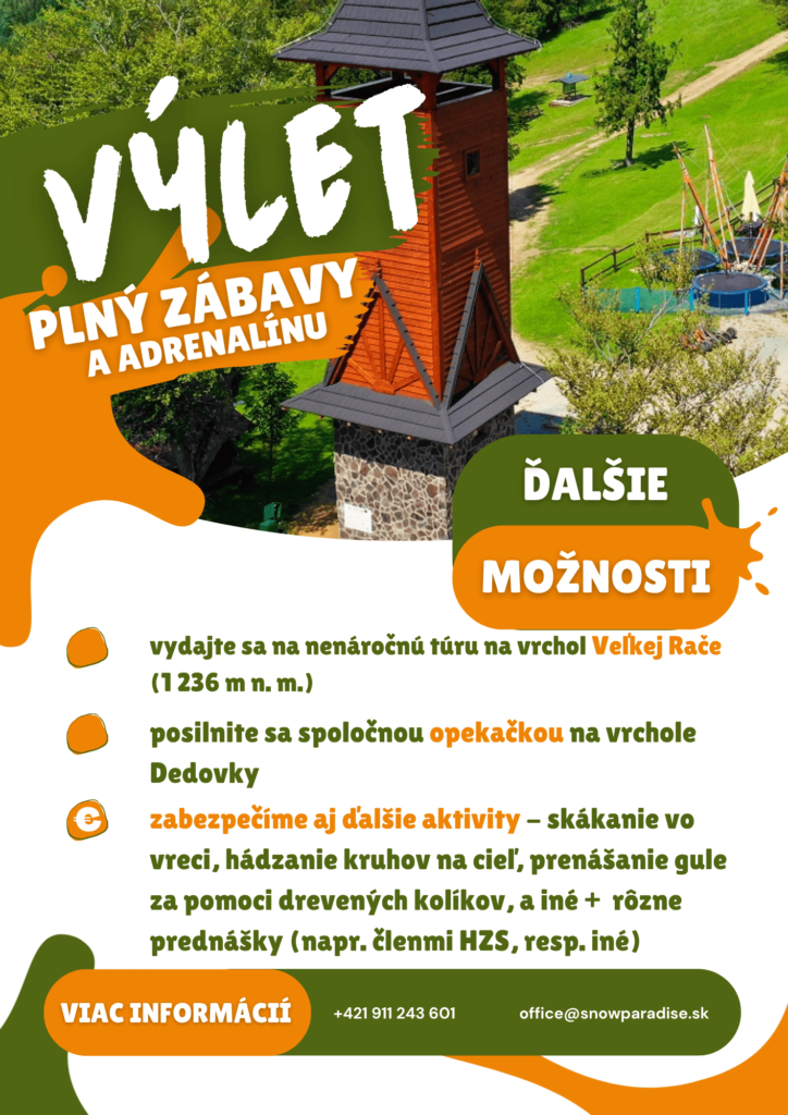 Pre školy a letné tábory ponúkame množstvo atrakcií a ďalších zážitkových aktivít na Veľkej Rači. Najväčším lákadlom je najdlhšia bobová dráha na Slovensku, horské kolobežky/trojkolky, lukostreľba, trampolíny, X-jump trampolína a pre najmenších aj detský lanový park. K atrakciám je možné sa dostať buď 4-sedačkovou lanovkou v Dedovke alebo pešo, čo je približne 45 minút z parkoviska v Dedovke.